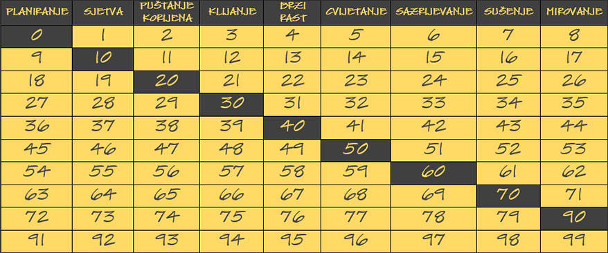 Ovo je jedan veoma stari način za određivanje sretnih godina; pogodnih za različite djelatnosti u životu. Kao u nekoj vrsti suvremenog bioritma koji se ne odnosi na dane već na godine. Ovim sistemom možete da se odredi godina u kojoj čovjek može da započne veće poduhvate, godina kada treba da se od toga suzdrži, i one u kojima mogu da se pripreme akcije; ali da se ne izvode. Kao što u prirodi postoji ritam, tako i u čovjekovom životu postoji potpuno određeni ritam. Tabela vrijedi za sve podjednako, koristimo ju na slijedeći način... Tablica se gleda s lijeva na desno po slijedu kojeg ima u trajanju od devet godina, kad stigne do kraja ciklusa kreće ispočetka. Svaki broj je jedna godina, a vi se nalazite upravo u trenutku ovisno na vaše trenutne godine koje imate kada gledate ovu vrstu proricanja budućnosti. Za svaku fazu dodatna objašnjenja nalaze se na kućama. Što znači ako se nalazimo na početku cjelokupnog životnog ciklusa dok se još nismo se rodili a već smo začeti, nalazimo se u polju planiranja dolaska na svijet. Uslijedit će sjetva kad započinje novi život. Pušta korijenje polako pužemo dok ne stanemo na svoje noge. Kada dođemo do klijanja postajemo svjesni sebe. Nakon što smo postali svjesni života, brzi rast nam omogućava da otkrijemo svijet i život općenito u kojem se nalazimo; jer tada imamo najveći potencijal. Linearni slijed možemo podijeliti na dva perioda; onaj kada se nešto započinje i onaj kada se nešto dovršava; pa tako gledajući svaki period zasebno i njih možemo promatrati na način da svaki od njih ima svoju početnu i završnu točku. Tako smo stigli do točke koja donosi rezultate ali se još uvijek nalazimo na početku slijedećeg ciklusa. Tako cvjetanje donosi vrijeme kada počinjemo da koristimo sva prikupljena znanja do tada. Započinju prve životne obaveze kada se kreće u školu to je vrijeme sazrijevanja. Ulaskom u, sušenje stigla je puna zrelosti devetogodišnjeg ciklusa; kada dolazimo i do posljednje točke koja nastupi s mirovanjem kada smatramo da sve znamo i da nam više ništa ne treba... ali ne zadugo jer ponovno krećemo u novi ciklus; kada sve učimo ispočetka, ali ne više iste stvari jer svaki ciklus nam donosi nova životna uzbuđenja koja nas prate tokom cijeloga života, u daljnjem odrastanju, zasnivanju obitelji i započinjanju karijere. Zaista ako pogledamo početnu i završnu točku cjelokupnog ciklusa po godinama, vidjet ćemo da smo u periodu planiranja bili najozbiljniji prema sebi i okolini; a vrijeme mirovanja davalo nam je sigurnost, koja je možda kod nekih izazvala razmetljivost. |